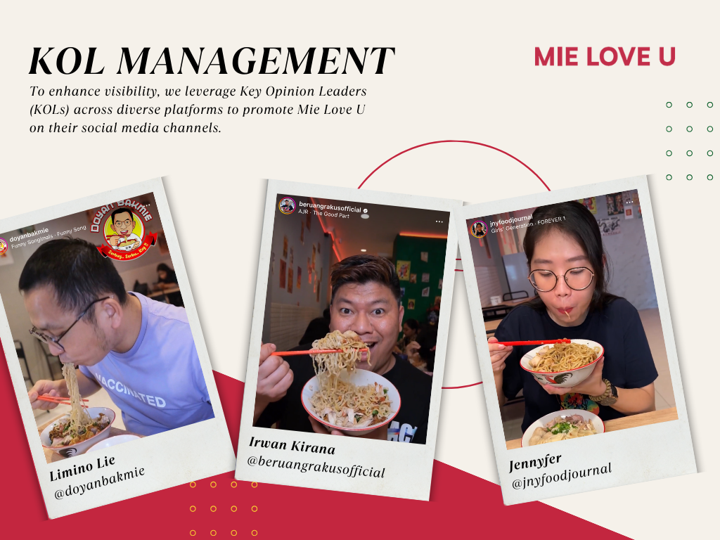 Through our strategic collaborations with distinguished Key Opinion Leaders (KOLs), mainly from the F&B and lifestyle field, we have effectively conveyed Mie Love U’s main messages and significantly enhanced brand recognition. This journey from the careful selection of KOLs to the supervision of their content uploads has been designed to ensure an impactful KOL engagement for Mie Love U.